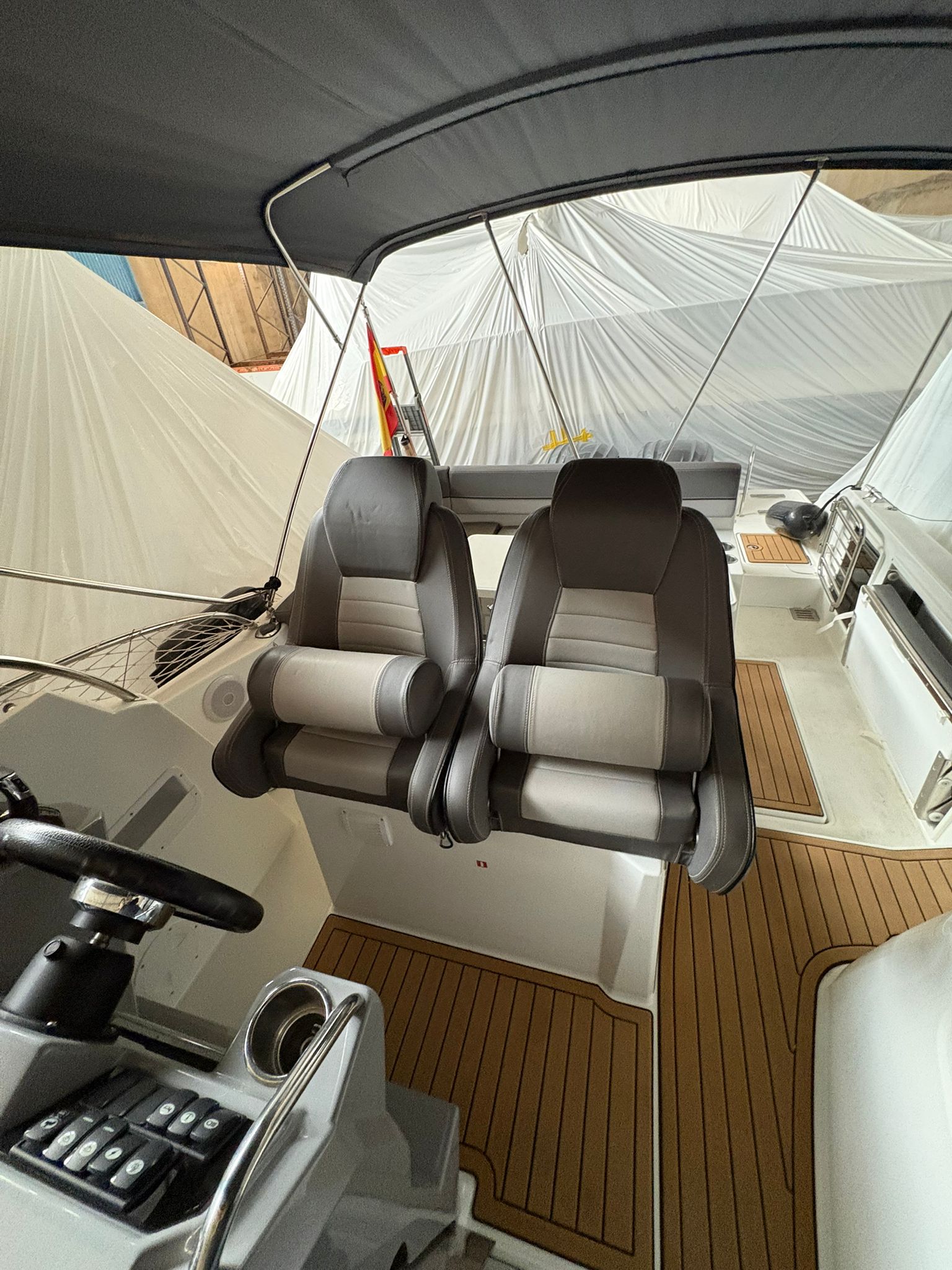 EQUIPO DE CUBIERTA: TOLDO BIMINI, LONA DE FONDEO, LONAS MICROPERFORADAS, MASTIL DE SKI, PLATAFORMAS DE BAÑO, MESA DE BAÑERA CONVERTIBLE EN SOLARIUM, COCINA DE GAS, DUCHA EN BAÑERA, SOLARIUM DE PROA CON RESPALDO AJUSTABLE, MASTIL DE ESQUI, BANCO LATERAL RETRACTIL A BABOR, LUCES LED DE CORTESIA, CUBIERTA SINTETICA SEADEK, NEVERA EN CUBIERTA DE 49 l.