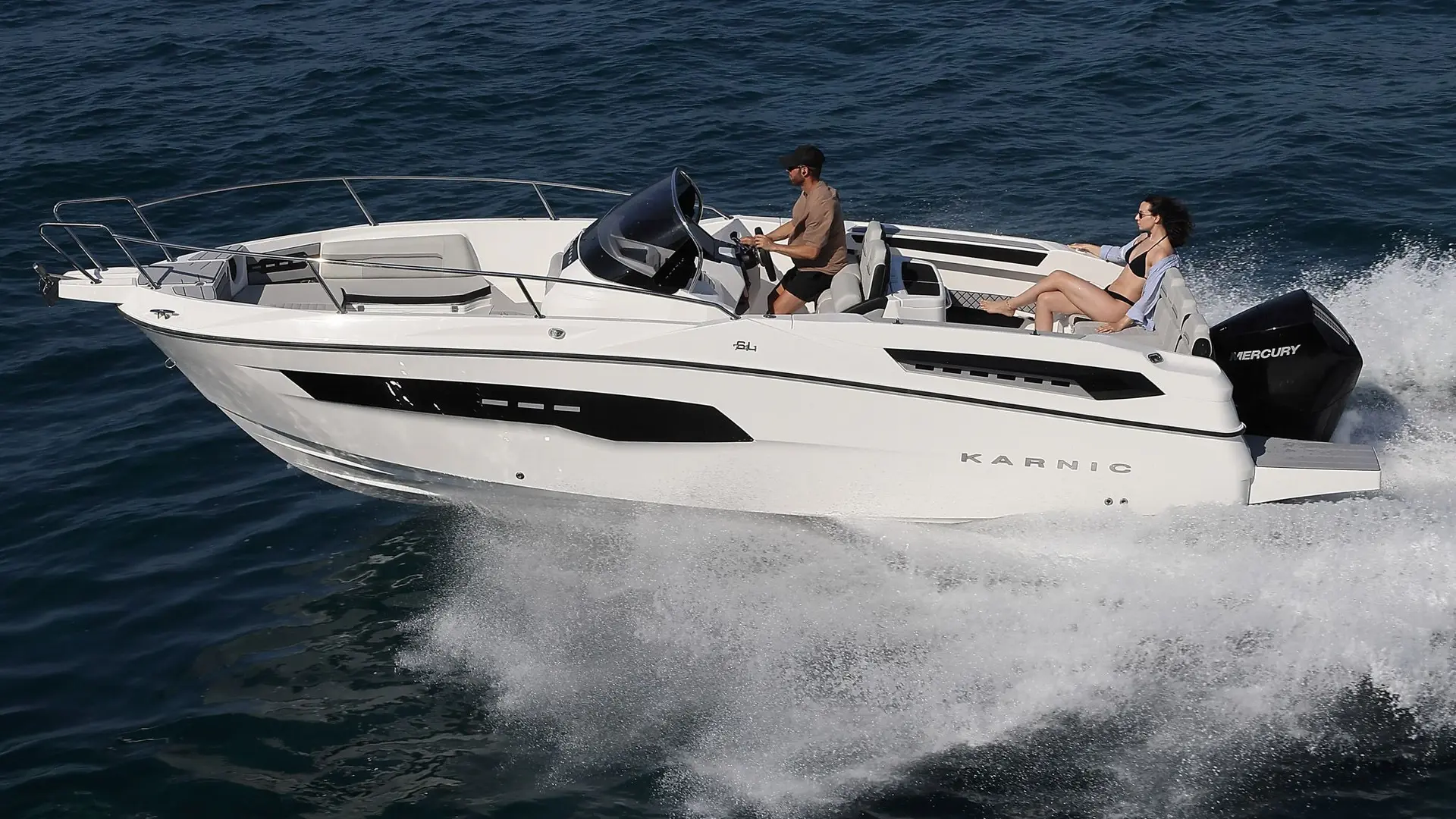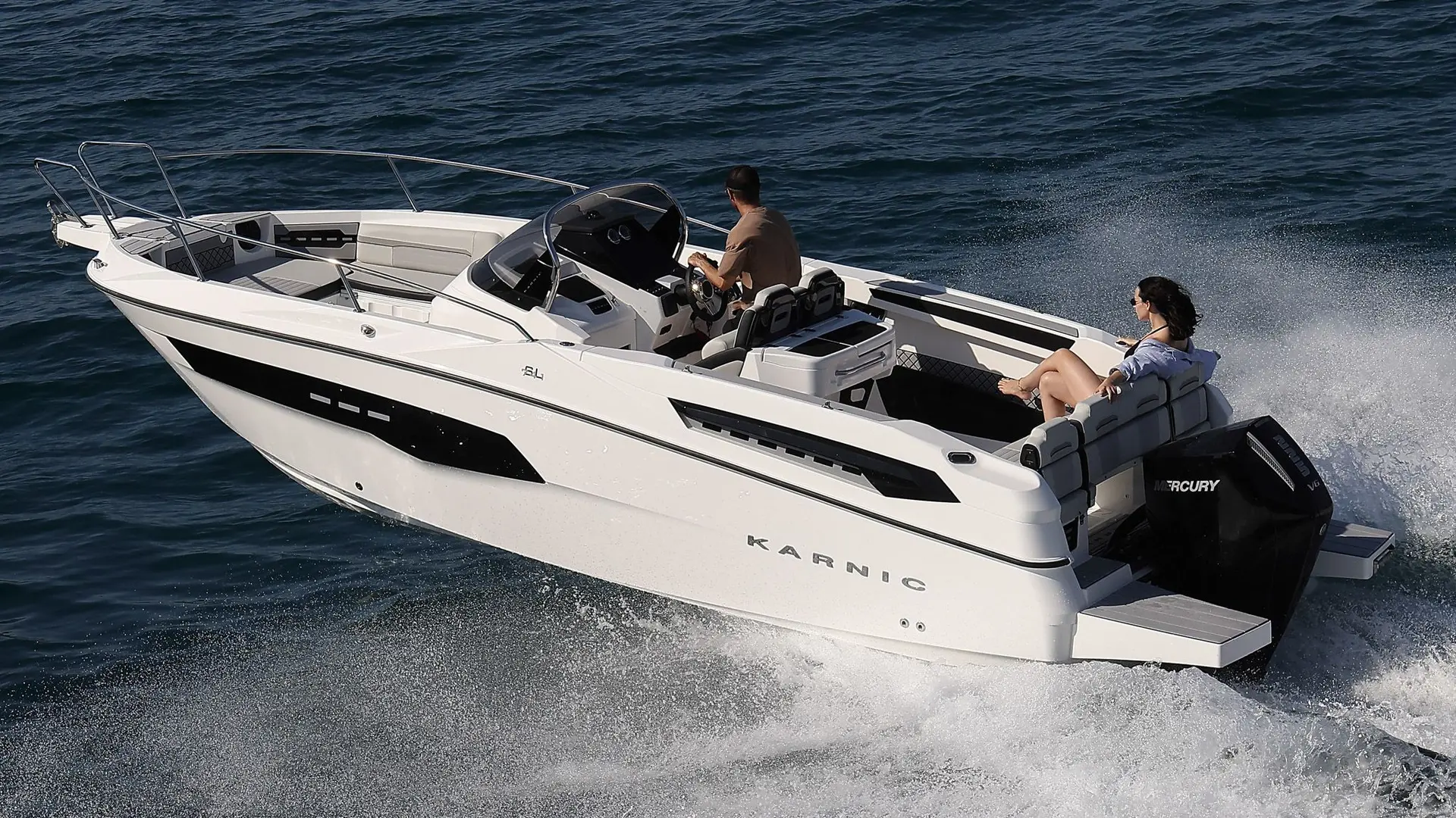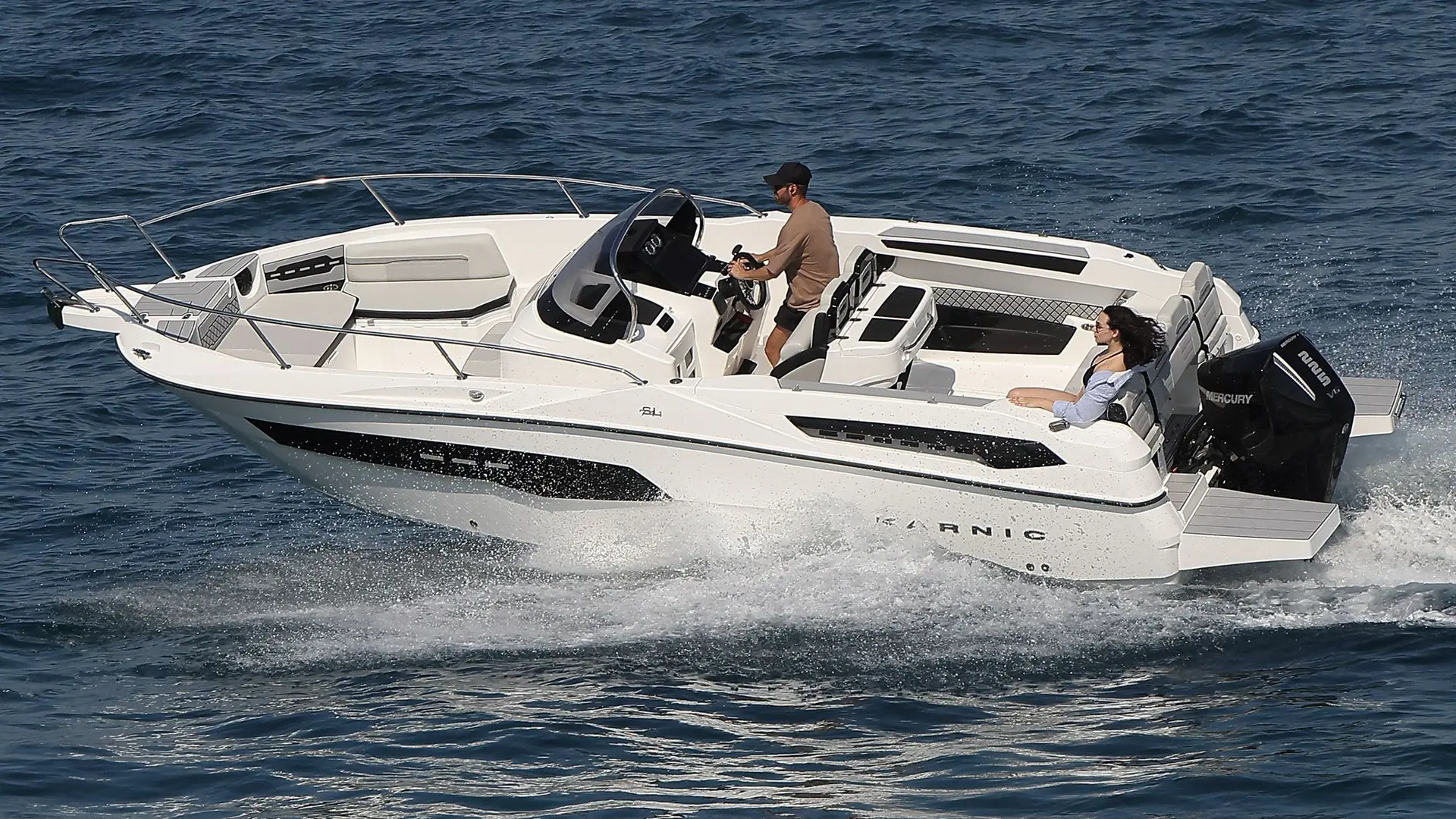 Embarcación Karnic Modelo SL 741 con motor Yamaha F250 con tapicería bicolor gris y toldo en negro.