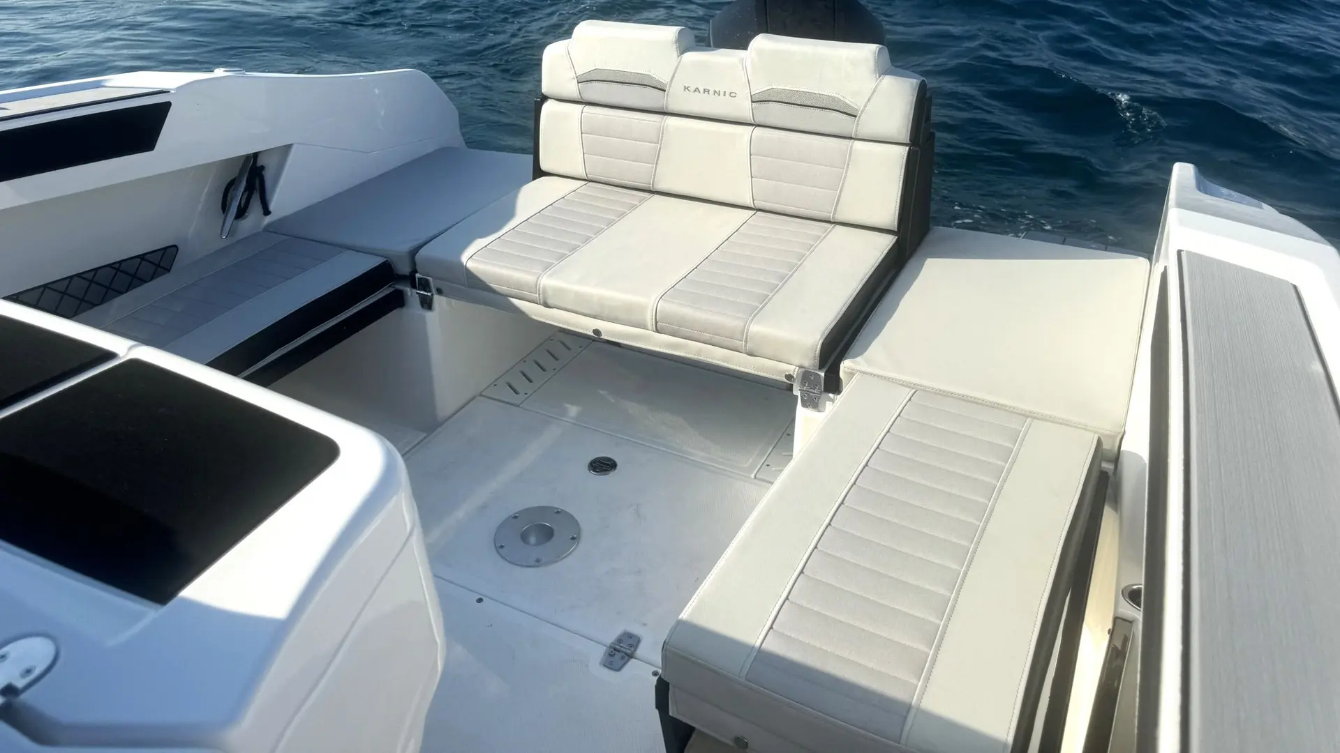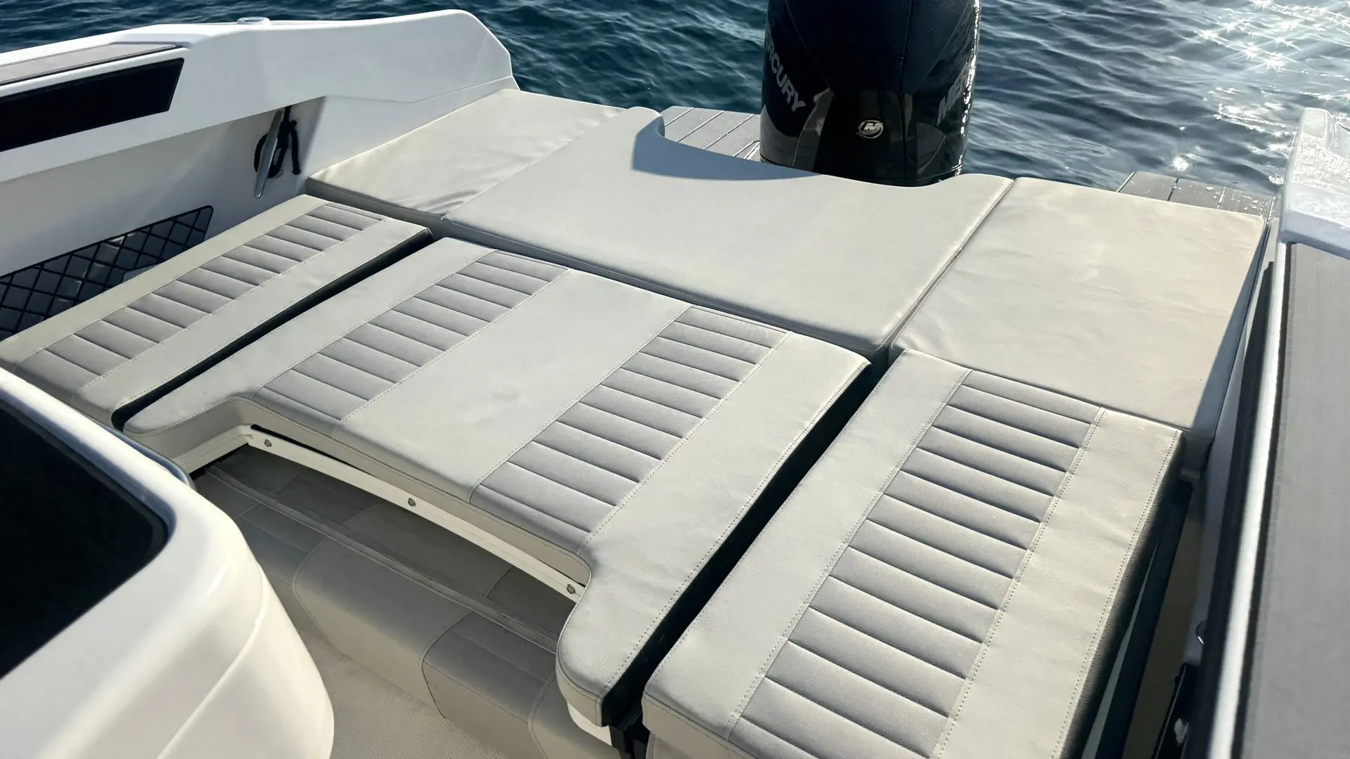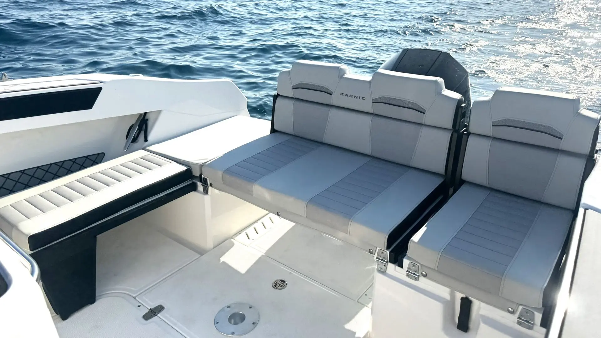 Extras: Plataformas de baño de popa con escalera de baño, Pack Seadeck antideslizante en plataformas de baño y bañera, asientos en U en proa incluidos respaldos, solárium central para asientos de proa, bimini top grande en bañera, funda para consola y asientos, Wc marino con depósito de aguas negras, dirección hidráulica con cilindro de dirección, hélice de proa, 2 portacañas empotrados en inox, molinete eléctrico (no incluye ancla ni cadena), instalación de batería de 100Ah con interruptor, conexión a tierra y cargador de baterías.