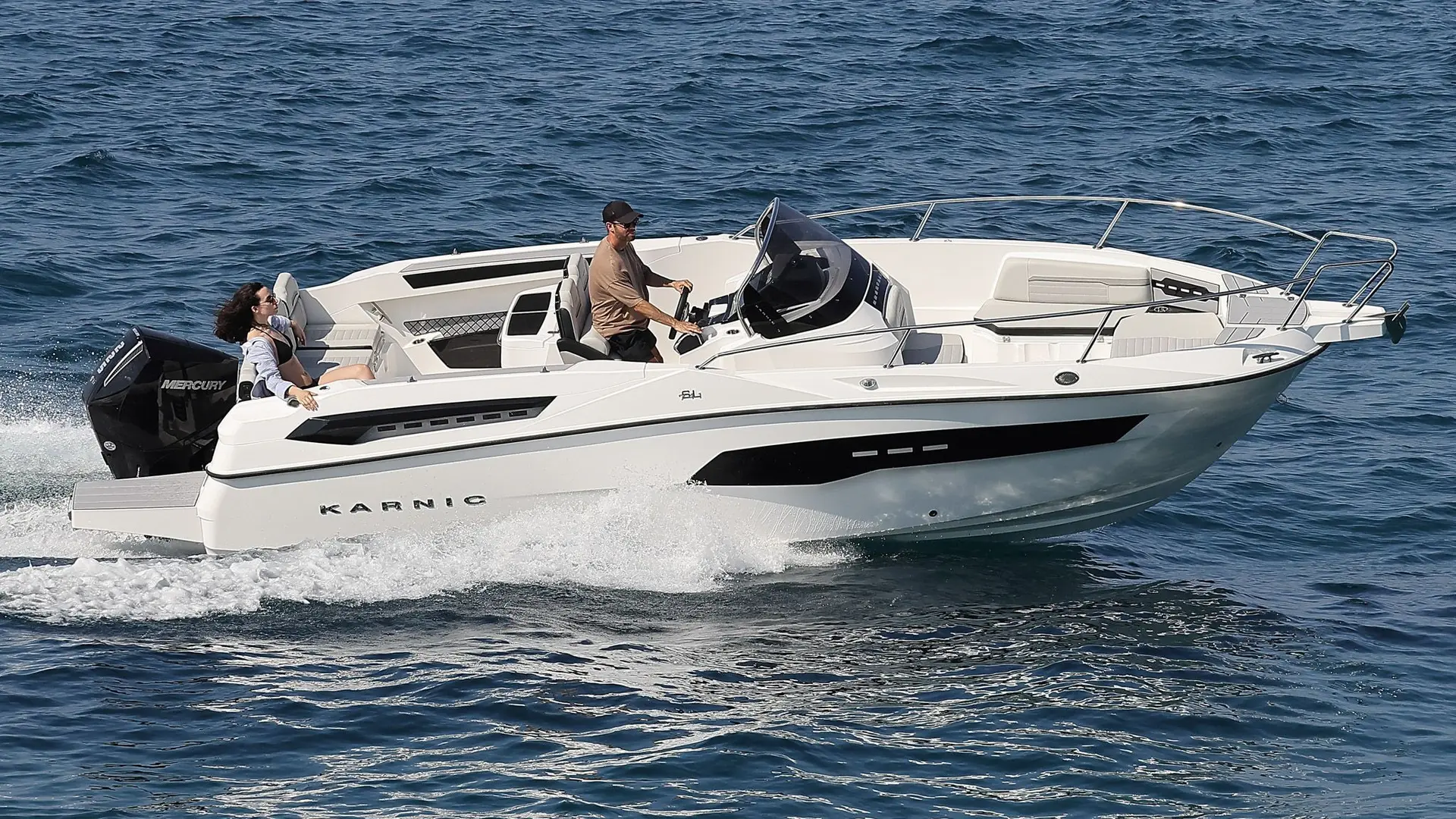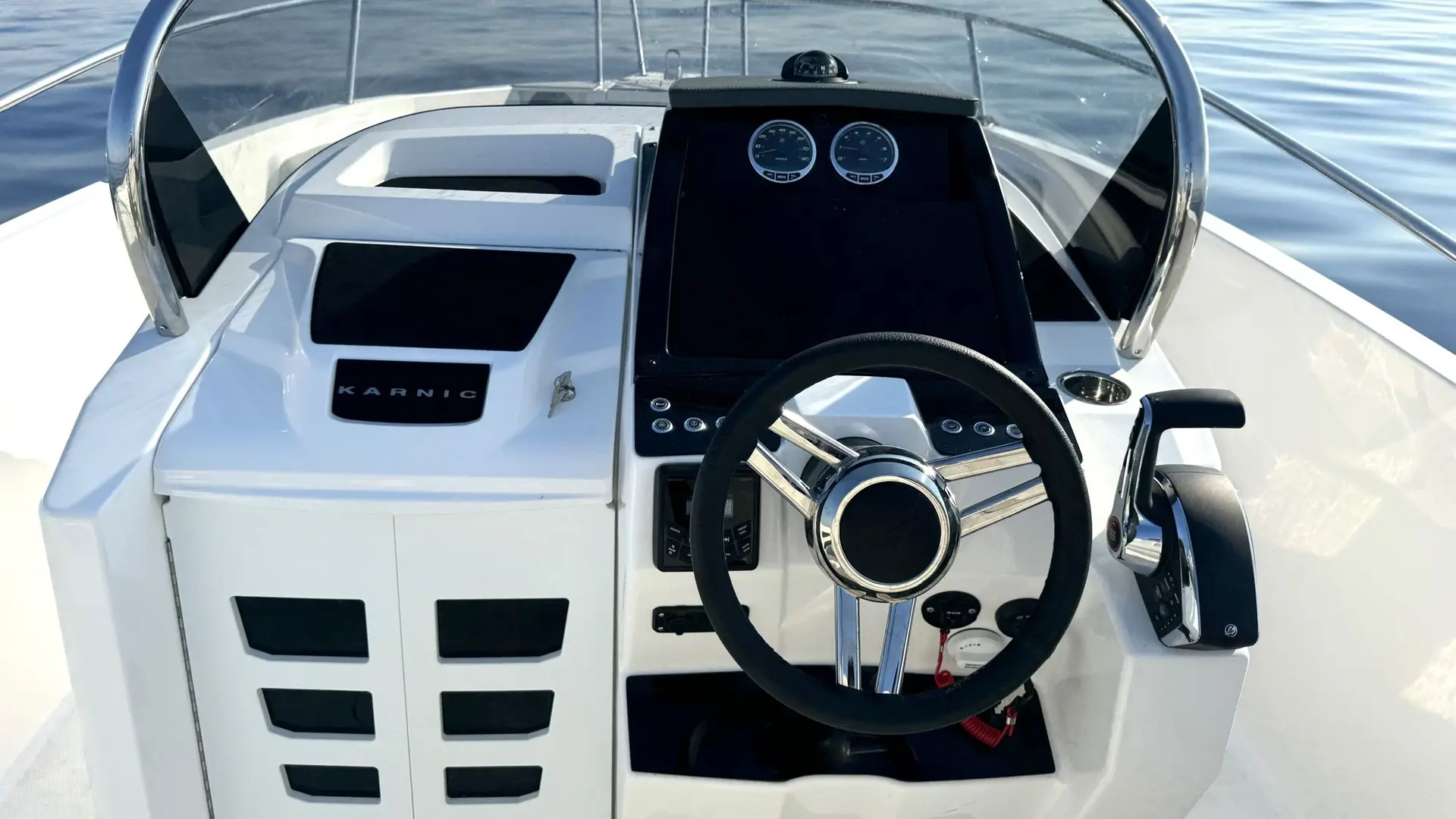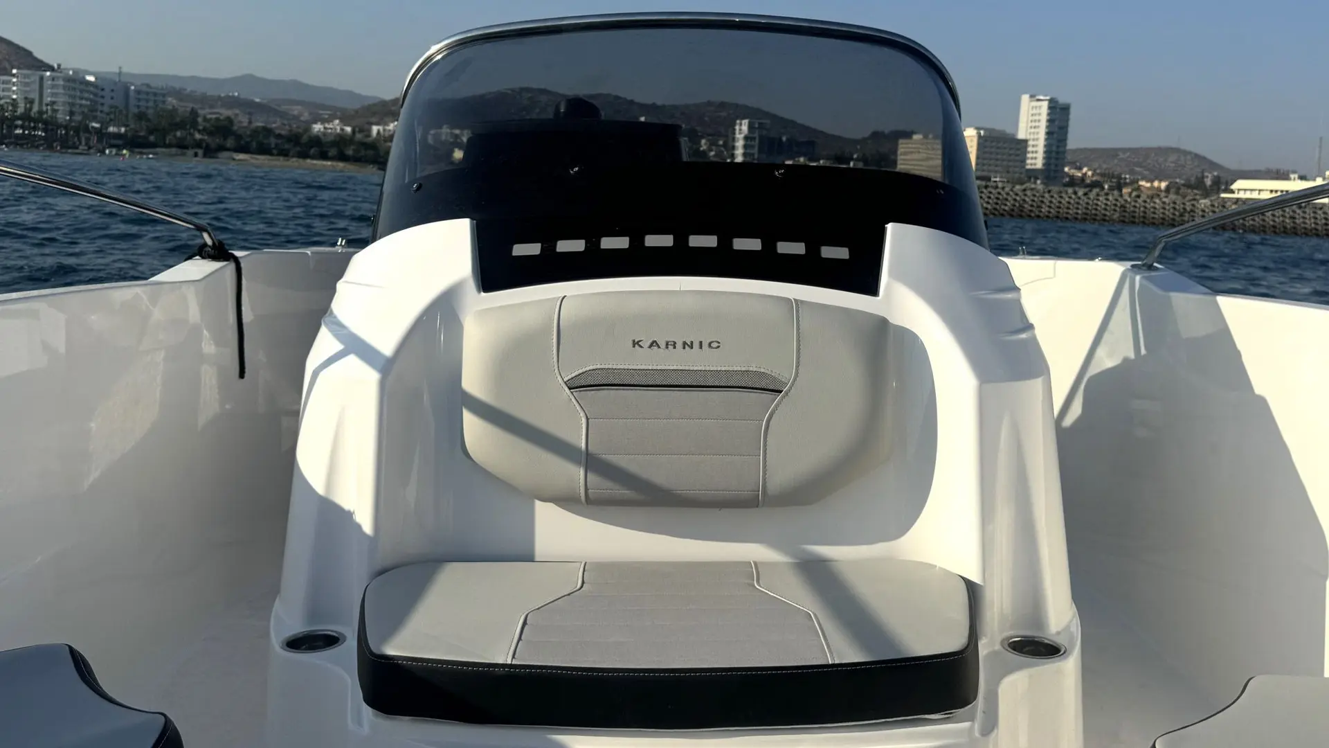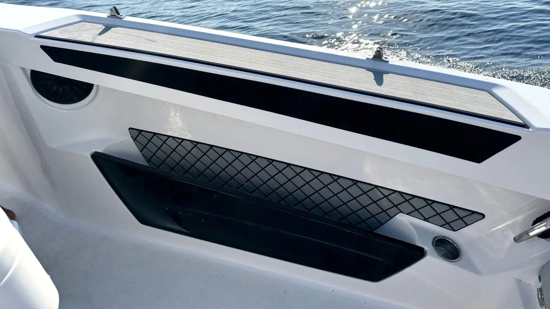 Extras: Plataformas de baño de popa con escalera de baño, Pack Seadeck antideslizante en plataformas de baño y bañera, asientos en U en proa incluidos respaldos, solárium central para asientos de proa, bimini top grande en bañera, funda para consola y asientos, Wc marino con depósito de aguas negras, dirección hidráulica con cilindro de dirección, hélice de proa, 2 portacañas empotrados en inox, molinete eléctrico (no incluye ancla ni cadena), instalación de batería de 100Ah con interruptor, conexión a tierra y cargador de baterías.